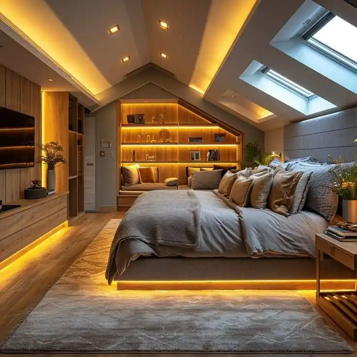 Sleek, minimalist design featuring clean lines and integrated lighting. Perfect for modern loft conversions with contemporary finishes. Handleless doors and premium materials create a sophisticated storage solution that enhances your loft’s modern aesthetic.
