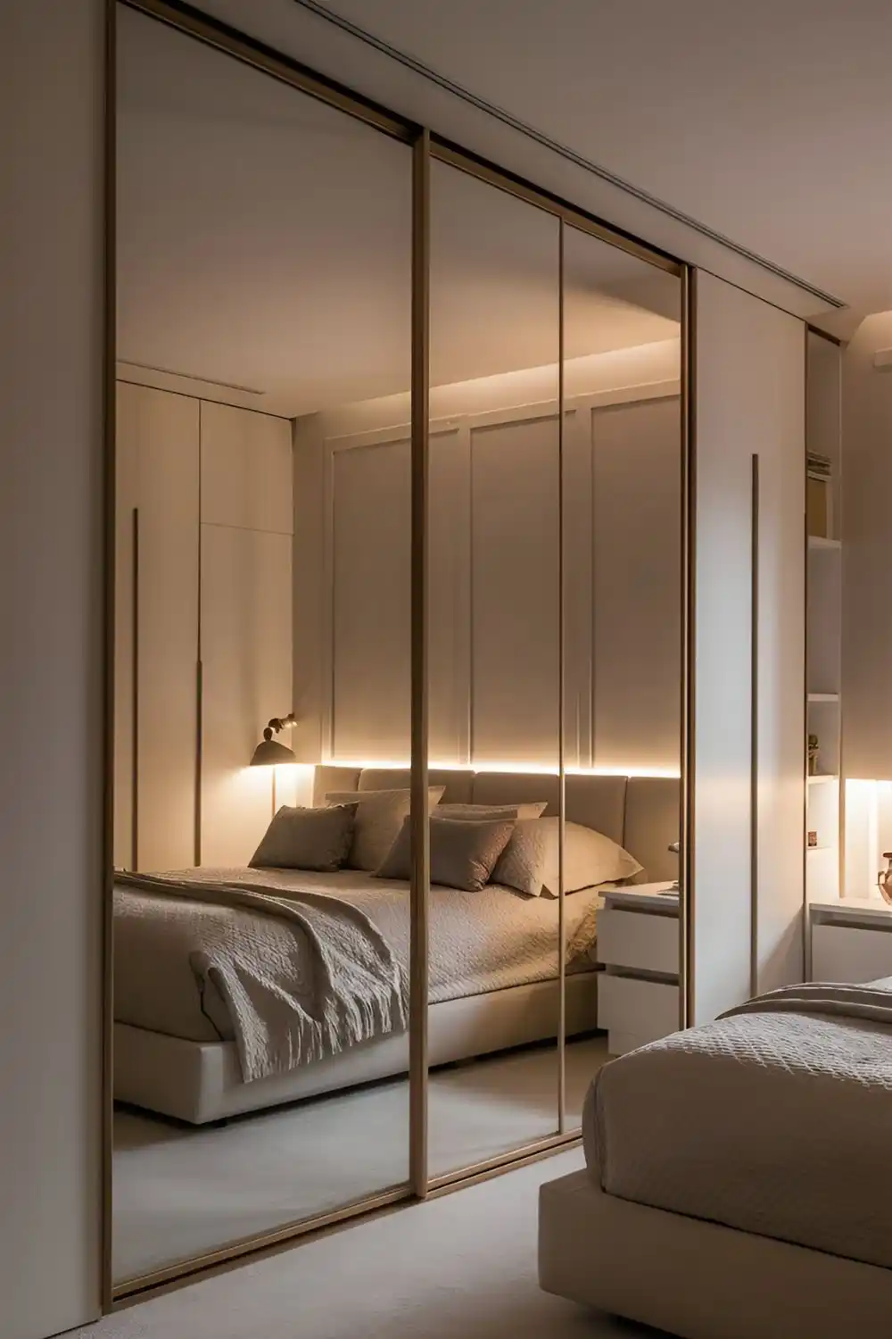 Mirrored sliding wardrobes are the ultimate space-saving solution that combines storage with functionality. The full-length mirrors create an illusion of expanded space, making even the smallest bedrooms feel larger and brighter.